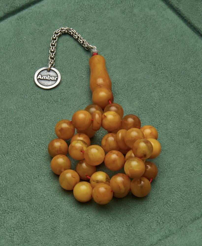 كهرمان ضغط قديم ٣٣ خرزة مع سلسال ولوقو فضة.